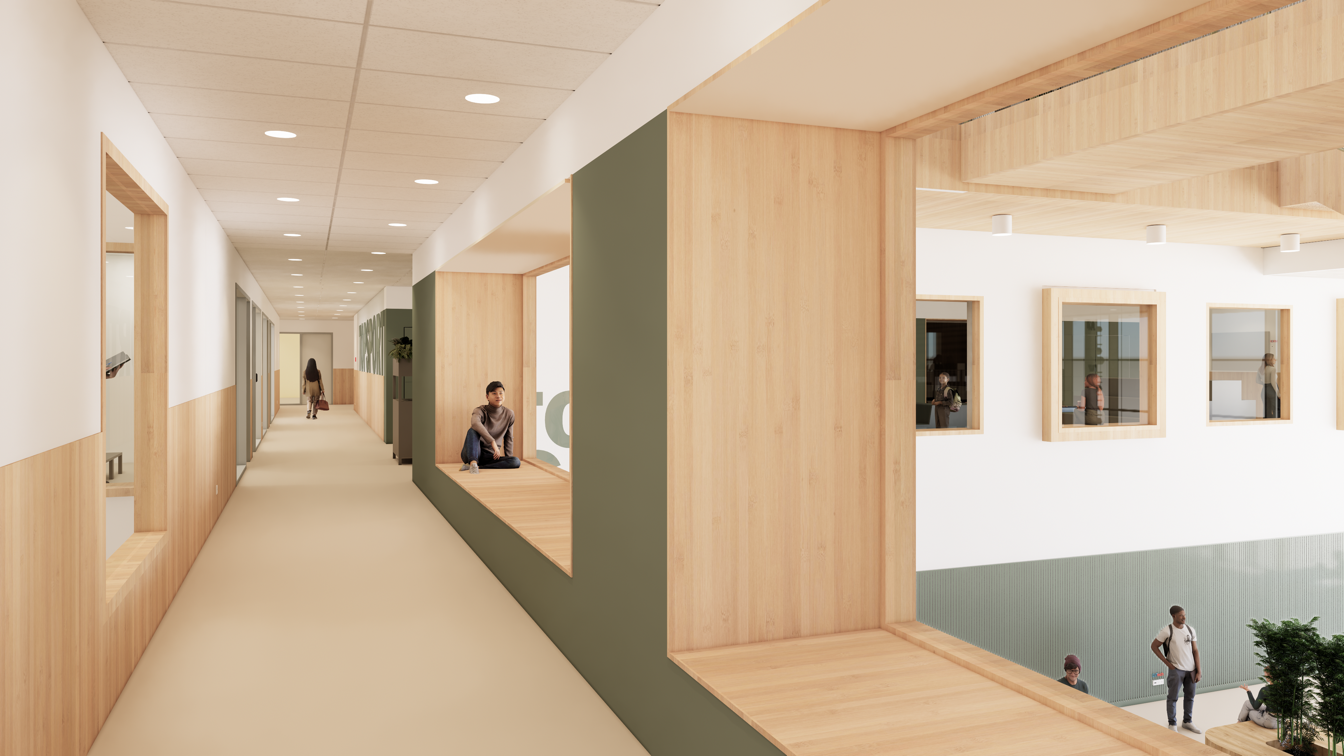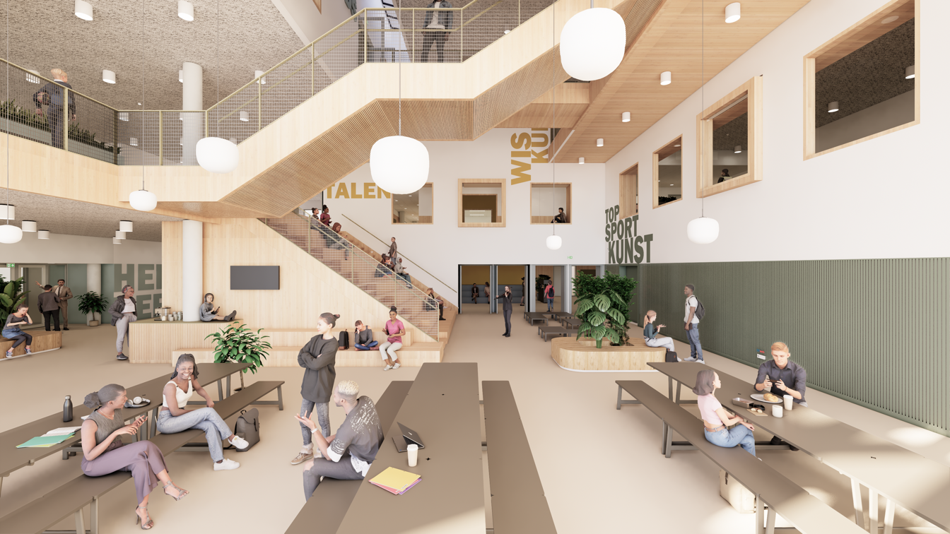 Op het bosrijke landgoed De Eikenburg wordt een nieuw onderwijscomplex gerealiseerd voor Parmant Joris en Parmant Helder. Het gebouw is compact opgezet met diepe vleugels, zodat zoveel mogelijk bestaande bomen behouden blijven. Centraal ligt een grote, drie lagen hoge aula met tribunetrap en daklicht: het hart van de school waar alle onderwijsruimtes op aansluiten. Het gebouw bevat daarnaast een theaterzaal, een Open Science Lab en een sportzaal die in drie delen deelbaar is.